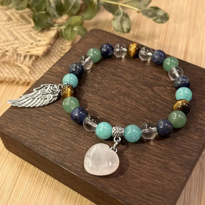 8mm Tiger's Eye & White Beads with Green Aventurine Angel Wing & Rose Quartz Heart Pendant